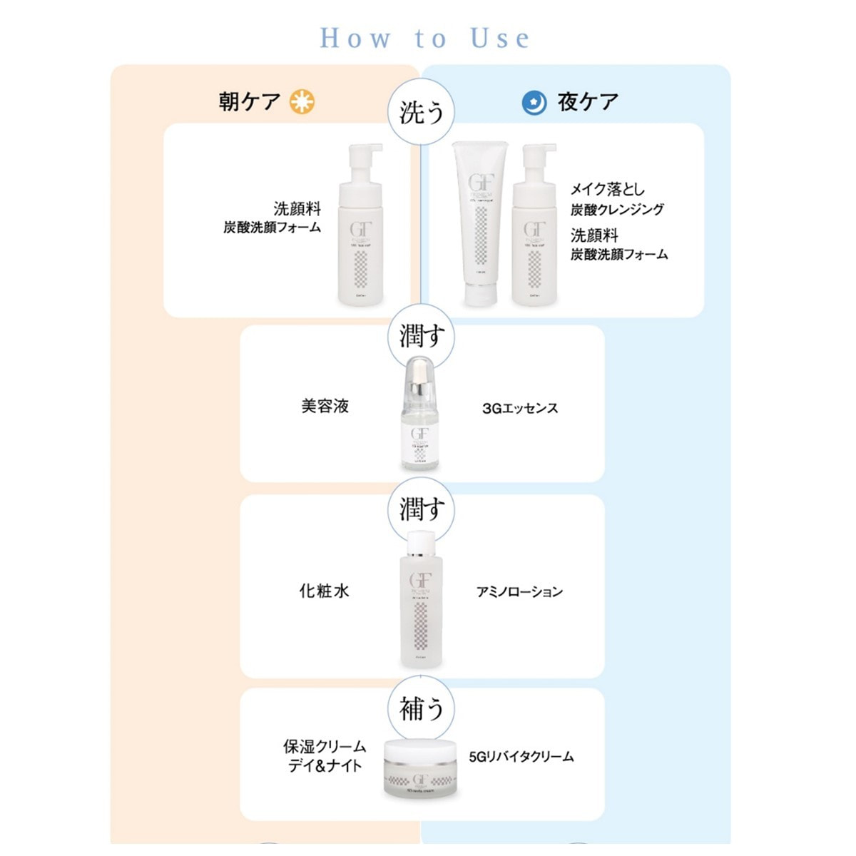 朝と夜の洗顔後に 別売の「セルケア3Gエッセンス」(美容液)を塗布した後、「セルケアEGアミノローション」(化粧水)を適量を手にとり、顔全体になじませ、小鼻や目の周りまで丁寧になじませます。