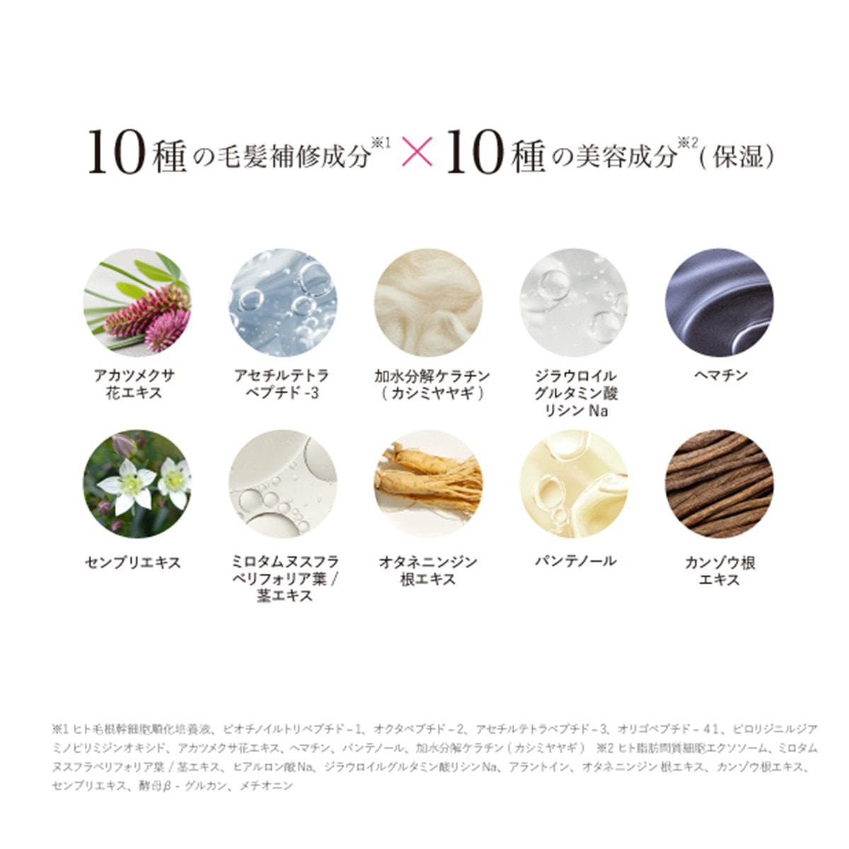 水、BG、グリセリン、加水分解水添デンプン、プロパンジオール、ヒト毛根幹細胞順化培養液、ヒト脂肪間質細胞エクソソーム、ビオチノイルトリペプチド-1、オクタペプチド-2、アセチルテトラペプチド-3、オリゴペプチド-41、ピロリジニルジアミノピリミジンオキシド、アカツメクサ花エキス、ミロタムヌスフラベリフォリア葉/茎エキス、ヘマチン、ヒアルロン酸Na、パンテノール、加水分解ケラチン(カシミヤヤギ)、ジラウロイルグルタミン酸リシンNa、アラントイン、オタネニンジン根エキス、カンゾウ根エキス、センブリエキス、酵母β-グルカン、メチオニン、シクロヘキサン-1,4-ジカルボン酸ビスエトキシジグリコール、ポリアクリロイルジメチルタウリンNa、デキストラン、1,2-ヘキサンジオール、t-ブタノール、フィチン酸、ペンテト酸5Na、ペンチレングリコール、フェノキシエタノール、酸化銀