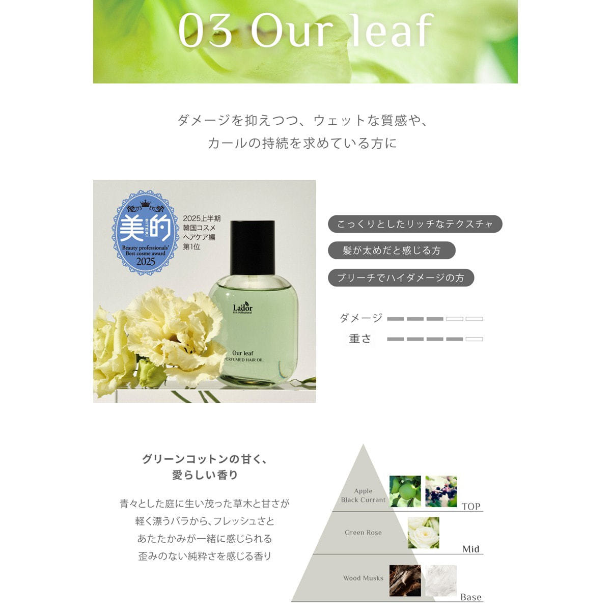 ・香り:グリーンコットンのさわやかさと、ほのかなバラの甘さを感じさせる香り。